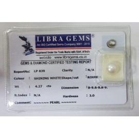 REPORT NO . LP 839CLARITY . N/ACOLOUR . SHINING WHITESHAPE / CUT . ROUNDWT . 4.27 CTSDIMENSION . 8-9.6-8.8-9.R . INDEX . N/AHARDNESS . 3.0COMMENT . PEARL..