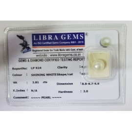 REPORT NO. LP 924CLARITY. N/ACOLOUR. SHINING WHITESHAPE/CUT. ROUNDWT. 3.81 CTSDIMENSION. 8.8-8.7-6.6R.INDEX. N/AHARDNESS. 3.0COMMENT. PEARL..