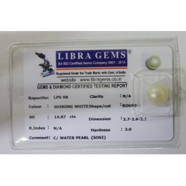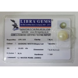 REPORT NO . LPS 103CLARITY . N/ACOLOUR . SHINING WHITESHAPE / CUT . ROUNDWT . 16.85 CTSDIMENSION . 3-2.3-2.3-2.R . INDEX . N/AHARDNESS . 3.0COMMENT . C / WATER PEARL { SOSI }..