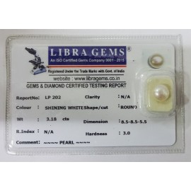 REPORT NO . LP 202CLARITY . N/ACOLOUR . SHINING WHITESHAPE / CUT . ROUNDWT . 3.18 CTSDIMENSION . 8-5.8-5.5-5.R . INDEX . N/AHARDNESS . 3.0COMMENT . PEARL..