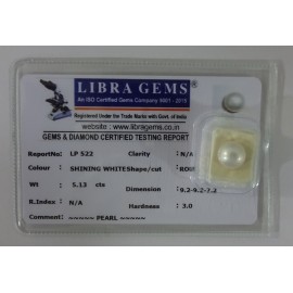 REPORT NO . LP 522CLARITY . N/ACOLOUR .SHINING WHITESHAPE / CUT . ROUNDWT . 5.13 CTSDIMENSION . 9-2.9-2.7-2.R . INDEX . N/AHARDNESS . 3.0COMMENT . PEARL..