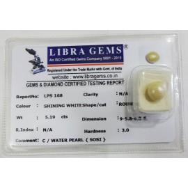 REPORT NO . LPS 168CLARITY . N/ACOLOUR . SHINING WHITESHAPE / CUT . ROUNDWT . 5.19 CTSDIMENSION . 9-5.8-6.8-6.R . INDEX . N/AHARDNESS . 3.0COMMENT . C / WATER PEARL { SOSI }..