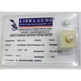 REPORT.NO.-LPS 315CLARITY.-N/ACOLOUR.-SHINING WHITESHAPE/CUT.-ROUNDWT.-3.96 CTSDIMENSION.-8-1.8-1.8-3.R.INDEX.-N/AHARDNESS.-3.0COMMENT.-C / WATER PEARL { SOSI }..