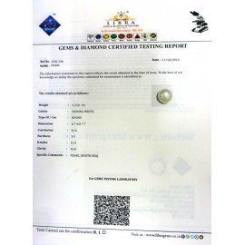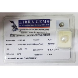 REPORT NO . LPSC 82CLARITY . N/ACOLOUR . SHINING WHITESHAPE / CUT . ROUNDWT . 4.92 CTSDIMENSION . 8-8.9-2.8-8.R . INDEX . N/AHARDNESS . 3.0COMMENT . PEARL { SOUTH SEA }..