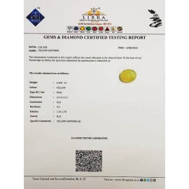 REPORT NO . LY 55CLARITY . N/ACOLOUR . YELLOWSHAPE / CUT . OVALWT . 6.04 CTSDIMENSION . 2-1.10-2.4-7.R . INDEX . 1.76-1.78HARDNESS . 9.0COMMENT . YELLOW SAPPHIRE..