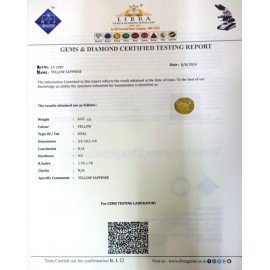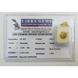 REPORT.NO.LY 577CLARITY.N/ACOLOUR.YELLOWSHAPE/CUT.OVAL WT.2.56 CTSDIMENSION.8.5-7.5-4.2R.INDEX.1.76-1.7.8HARDNESS.9.0COMMENT.YELLOW SAPPHIRE..