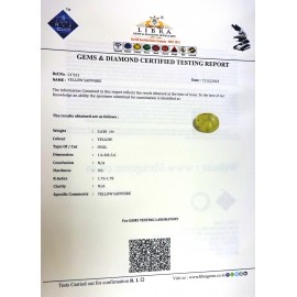 REPORT.NO.LY 391CLARITY.N/ACOLOUR.YELLOWSHAPE/CUT.OVALWT.5.28 CTSDIMENSION.2.2-9.9-4.5R.INDEX.1.76-1.78HARDNESS.N/ACOMMENT.YELLOW SAPPHIRE..