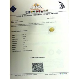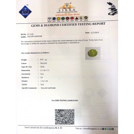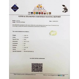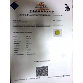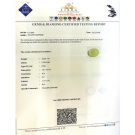 REPORT NO . LY 298CLARITY . N/ACOLOUR . YELLOWSHAPE / CUT . OVALWT . 3.77 CTSDIMENSION . 8-6.8-3.5-5.R . INDEX . 1.76-1.78HARDNESS . 9.0COMMENT . YELLOW SAPPHIRE..