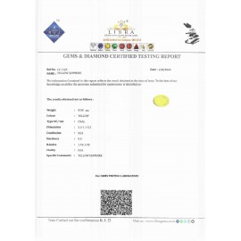 REPORT.NO.-LY 694CLARITY.-N/ACOLOUR.-YELLOWSHAPE/CUT.-OVALWT.-5.60 CTSDIMENSION.-10-7.9-7.5-1.R.INDEX.-1.76-1.78HARDNESS.-9.0COMMENT.-YELLOW SAPPHIRE..