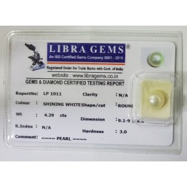 REPORT NO . LP 1011CLARITY . N/ACOLOUR . SHINING WHITESHAPE / CUT . ROUNDWT . 4.29 CTSDIMENSION . 9-1.9-1.6-5.R . INDEX . N/AHARDNESS . 3.0COMMENT . PEARL..