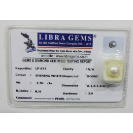 REPORT NO . LP 673CLARITY . N/ACOLOUR . SHINING WHITESHAPE / CUT . ROUNDWT . 3.70 CTSDIMENSION . 8-1.8-1.6-6.R . INDEX . N/AHARDNESS . 3.0COMMENT . PEARL..