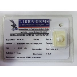 REPORT NO . LP 829CLARITY . N/ACOLOUR . SHINING WHITESHAPE / CUT . ROUNDWT . 4.20 CTSDIMENSION . 8-7.6-9.8-7.R . INDEX . N/AHARDNESS . 3.0COMMENT . PEARL..