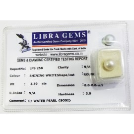 REPORT.NO.-LPS 258CLARITY.-N/ACOLOUR.-SHINING WHITESHAPE/CUT.-ROUNDWT.-3.39 CTSDIMENSION.-8-8.8-8.8-9.R.INDEX.-N/AHARDNESS.-3.0COMMENT.-C / WATER PEARL { SOSI }..