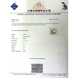 REPORT NO . LP 60CLARITY . N/ACOLOUR . SHINING WHITESHAPE / CUT . ROUNDWT . 5.19 CTSDIMENSION . 9-9.10-1.6-7.R . INDEX . N/AHARDNESS . 3.0COMMENT . PEARL..