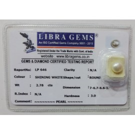 REPORT NO . LP 646CLARITY . N/ACOLOUR . SHINING WHITESHAPE / CUT . ROUNDWT . 2.78 CTSDIMENSION . 7-6.7-6.6-1.R . INDEX . N/AHARDNESS . 3.0COMMENT . PEARL..