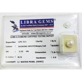 REPORT.NO.-LPS 311CLARITY.-N/ACOLOUR.-SHINING WHITESHAPE/CUT.-ROUNDWT.-3.55 CTSDIMENSION.-7-8.7-9.7-9.R.INDEX.-N/AHARDNESS.-3.0COMMENT.-C / WATER PEARL { SOSI }..