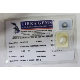 REPORT NO . LPSC 39CLARITY . N/ACOLOUR . SHINING WHITESHAPE / CUT . ROUNDWT . 5.96 CTSDIMENSION . 9-1.9-8.9-1.R . INDEX . N/AHARDNESS . 3.0COMMENT . PEARL { SOUTH SEA }..