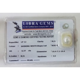 REPORT NO . LP 12CLARITY . N/ACOLOUR . SHINING WHITESHAPE / CUT . ROUNDWT . 6.37 CTSDIMENSION . 10-4.7-1.10-4.R . INDEX . N/AHARDNESS . 3.0COMMENT . PEARL..