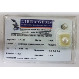 REPORT NO . LP 129CLARITY . N/ACOLOUR . SHINING WHITESHAPE / CUT . ROUNDWT . 3.84 CTSDIMENSION . 8-2.8-2.7-4.R . INDEX . N/AHARDNESS . 3.0COMMENT . PEARL..