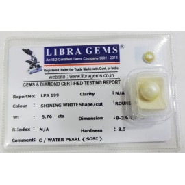 REPORT NO . LPS 199CLARITY . N/ACOLOUR . SHINING WHITESHAPE / CUT . ROUNDWT . 5.76 CTSDIMENSION . 9-2.9-1.9-3.R . INDEX . N/AHARDNESS . 3.0COMMENT . C / WATER PEARL { SOSI }..