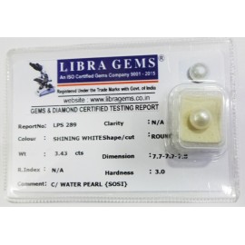 REPORT.NO.-LPS 289CLARITY.-N/ACOLOUR.-SHINING WHITESHAPE/CUT.-ROUNDWT.-3.43 CTSDIMENSION.-7-7.7-7.7-8.R.INDEX.-N/AHARDNESS.-3.0COMMENT.-C / WATER PEARL { SOSI }..