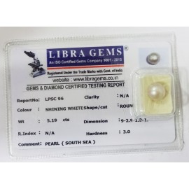 REPORT NO . LPSC 96CLARITY . N/ACOLOUR . SHINING WHITESHAPE / CUT . ROUNDWT . 5.19 CTSDIMENSION . 9-2.9-1.9-1.R . INDEX . N/AHARDNESS . 3.0COMMENT . PEARL { SOUTH SEA }..