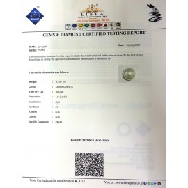 REPORT.NO.LP 1151CLARITY.N/A COLOUR.SHINING WHITE SHAPE/CUT.ROUND WT.6.24 CTS DIMENSION.10.6-10.6-7.1R.INDEX.N/AHARDNESS.3.0COMMENT.PEARL ..