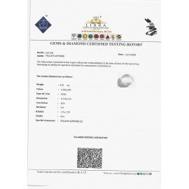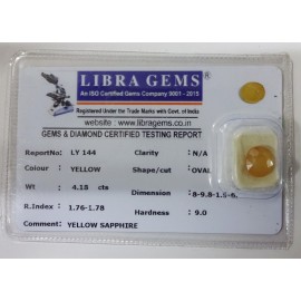 REPORT NO . LY 144CLARITY . N/ACOLOUR . YELLOWSHAPE / CUT . OVALWT . 4.18 CTSDIMENSION . 8-9.8-1.5-6.R . INDEX . 1.76-1.78HARDNESS . 9.0COMMENT . YELLOW SAPPHIRE..