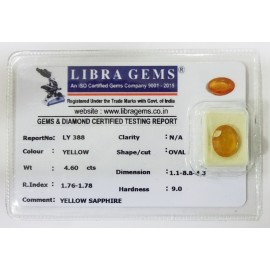 REPORT.NO.LY 388CLARITY.N/ACOLOUR.YELLOWSHAPE/CUT.OVALWT.4.60 CTSDIMENSION.1.1-8.8-4.3R.INDEX.1.76-1.78HARDNESS.9.0COMMENT.YELLOW SAPPHIRE..