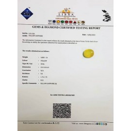 REPORT NO . LYA 39CLARITY . N/ACOLOUR . YELLOWSHAPE / CUT . OVALWT . 4.67 CTSDIMENSION . 10-2.9-1.5-4.R . INDEX . 1.76-1.78HARDNESS . 9.0COMMENT . YELLOW SAPPHIRE { A }..