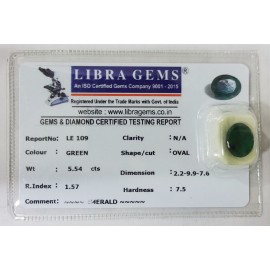REPORT NO . LE 109CLARITY . N/ACOLOUR . GREENSHAPE / CUT . OVALWT . 5.54 CTSDIMENSION . 2-2.9-9.7-6.R . INDEX . 1.57HARDNESS . 7.5COMMENT . EMERALD..