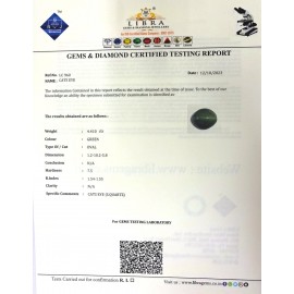 REPORT.NO.-LC 708CLARITY.-N/ACOLOUR.-GREENSHAPE/CUT.-OVALWT.-5.58 CTSDIMENSION.-10-5.9-7.7-8.R.INDEX.- 1.54-1.55HARDNESS.-7.5COMMENT.-CATS EYE { S . QUARTZ }..