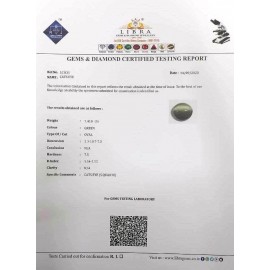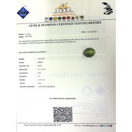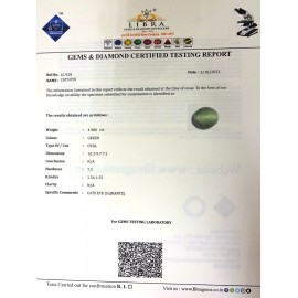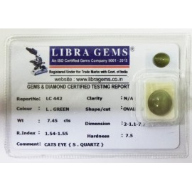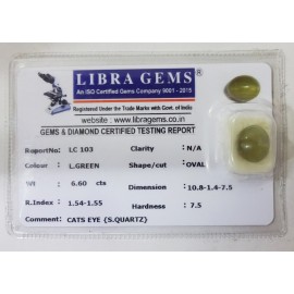 REPORT NO . LC 103CLARITY . N/ACOLOUR . L . GREENSHAPE / CUT . OVALWT . 6.20 CTSDIMENSION . 10-8.1-4.7-5.R . INDEX . 1.54-1.55HARDNESS . 7.5COMMENT . CATS EYE { S . QUARTZ }..