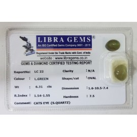 REPORT NO . LC 22CLARITY . N/ACOLOUR . L . GREENSHAPE / CUT . OVALWT . 6.31 CTSDIMENSION . 1-6.10-5.7-4.R . INDEX . 1.54-1.55HARDNESS . 7.5COMMENT . CATS EYE { S . QUARTZ }..