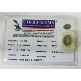 REPORT.NO.LC 416CLARITY.N/ACOLOUR.L.GREENSHAPE/CUT.OVALWT.9.25 CTSDIMENSION.3.7-10.6-9.1R.INDEX.1.54-1.55HARDNESS.7.5COMMENT.CATS EYE {S.QUARTZ}..