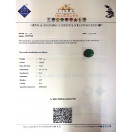 REPORT NO . LE 113CLARITY . N/ACOLOUR . GREENSHAPE / CUT . OVALWT . 7.01 CTSDIMENSION . 4-7.10-9.6-1.R . INDEX . 1.57HARDNESS . 7.5COMMENT . EMERALD..