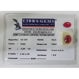 REPORT NO . LR 150CLARITY . N/ACOLOUR . PINKSHAPE / CUT . OVALWT . 3.04 CTSDIMENSION . 9-4.7-2.4-3.R . INDEX . 1.76-1.78HARDNESS . 9.0COMMENT . RUBY..