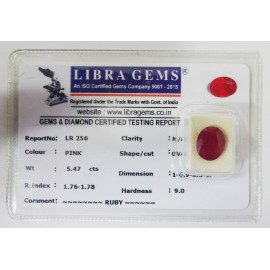 REPORT NO . LR 256CLARITY . N/ACOLOUR . PINKSHAPE / CUT . OVALWT . 5.47 CTSDIMENSION . 1-6.9-5.5-9.R . INDEX . 1.76-1.78HARDNESS . 9.0COMMENT . RUBY..