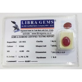 REPORT.NO.LR 461CLARITY.N/ACOLOUR.PINKSHAPE/CUT.OVALWT.4.00 CTSDIMENSION.10.1-8.1-4.8R.INDEX.1.76-1.78HARDNESS.9.0COMMENT.RUBY..