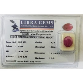 REPORT.NO.-LRA 131CLARITY.-N/ACOLOUR.-PINKSHAPE/CUT.-OVALWT.-8.59 CTSDIMENSION.-2-1.9-9.7-1.R.INDEX.-1.76-1.78HARDNESS.-9.0COMMENT.-RUBY { A }..