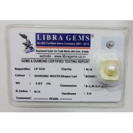 REPORT NO . LP 610CLARITY . N/ACOLOUR . SHINING WHITESHAPE / CUT . ROUNDWT . 3.83 CTSDIMENSION . 8-1.8-2.7-2.R . INDEX . N/AHARDNESS . 3.0COMMENT . PEARL..