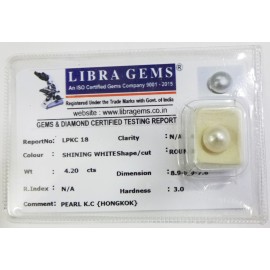 REPORT.NO.-LPKC 18CLARITY.-N/ACOLOUR.-SHINING WHITESHAPE/CUT.-ROUNDWT.-4.20 CTSDIMENSION.-8-9.8-9.7-6.R.INDEX.-N/AHARDNESS.-3.0COMMENT.-PEARL K.C { HONGKOK }..