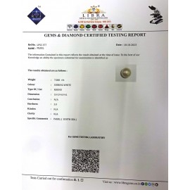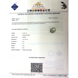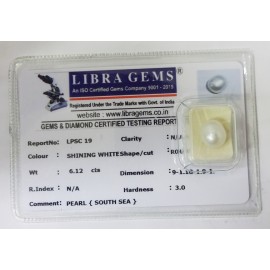 REPORT NO . LPSC 19CLARITY . N/ACOLOUR . SHINING WHITESHAPE / CUT . ROUNDWT . 6.12 CTSDIMENSION . 9-1.10-1.9-1.R . INDEX . N/AHARDNESS . 3.0COMMENT . PEARL { SOUTH SEA }..