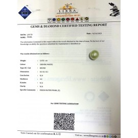 REPORT NO . LP 297CLARITY . N/ACOLOUR . SHINING WHITESHAPE / CUT . ROUNDWT . 12.10 CTSDIMENSION . 2-8.9-3.2-8.R . INDEX . N/AHARDNESS . 3.0COMMENT . PEARL..