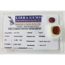 REPORT NO . LH 152CLARITY . N/ACOLOUR . COCA COLASHAPE / CUT . ROUNDWT . 4.38 CTSDIMENSION . 10-9.10-4.3-7.R . INDEX . 1.92-2.02HARDNESS . 6.5-7.5COMMENT . HESSONITE..