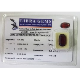 REPORT.NO.-LH 432CLARITY.-N/ACOLOUR.-COCA COLASHAPE/CUT.-OVALWT.-5.15 CTSDIMENSION.-2-4.1-2.3-8.R.INDEX.-1.92-2.02HARDNESS.-6.5-7.5COMMENT.-HESSONITE..