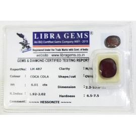 REPORT.NO.-LH 487CLARITY.-N/ACOLOUR.-COCA COLASHAPE/CUT.-OVALWT.-6.01 CTSDIMENSION.-2-2.10-6.4-7.R.INDEX.-1.92-2.02HARDNESS.-6.5-7.5COMMENT.-HESSONITE..