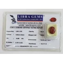DATE: 15-4-2025REF.NO: LHS 496NAME: HESSONITEWEIGHT: 4.40 CTSCOLOUR: COCA COLATYPE OF/CUT: OVALDIMENSION: 1.1-9.1-5.3/CONCLUSION: N/AHARDNESS: 6.5-7.5R.INDEX: 1.92-2.02CLARITY: N/ASPECIFIC COMMENTS: H..