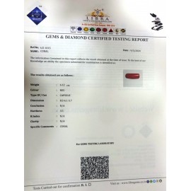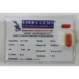 REPORT NO . LCI 196CLARITY . N/ACOLOUR . REDSHAPE / CUT . CAPSULEWT . 3.80 CTSDIMENSION . 6-1.4-2.5-3.R . INDEX . N/AHARDNESS . 3.5COMMENT . CORAL..