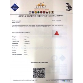 REPORT. NO. LCI 47CLARITY. N/ACOLOUR. REDSHAPE/CUT. TRIANGLEWT. 3.88 CTSDIMENSION. 1.1-1.3-5.1R. INDEX. N/AHARDNESS. 3.5COMMENT. CORAL..